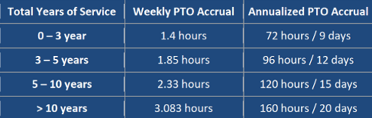 Full-time, exempt employees (working 40 hours per week) earn PTO each week, based on how long they’ve worked at the company. The amount you earn depends on your years of service as of your seniority date, following this schedule: